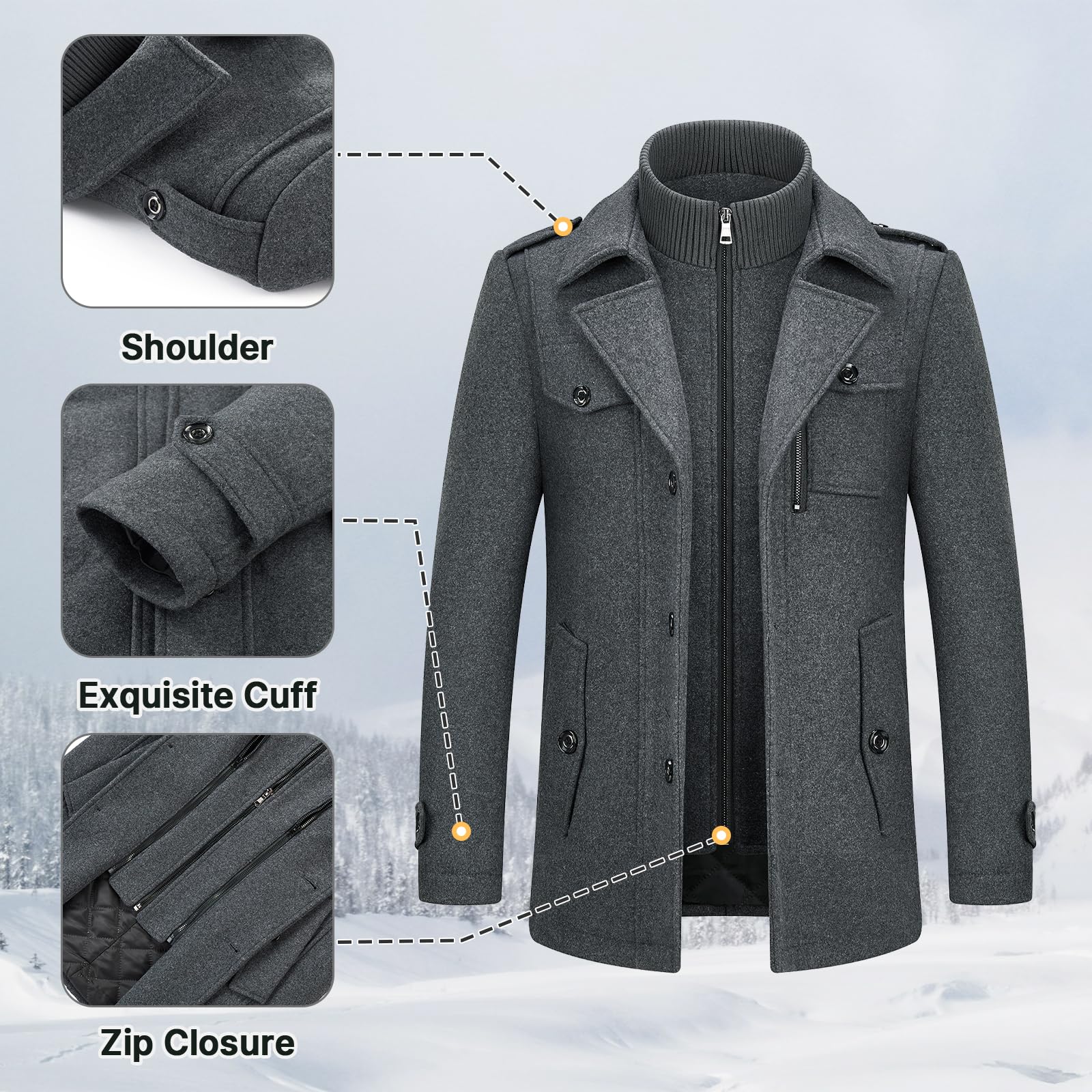 【Material】: 70% wool, 30% polyester fiber. Lining: 100% polyester fiber. Our Men's Wool Coat blends high-quality materials, combining wool and polyester, to ensure exceptional comfort and long-lasting durability. Warm and insulated to wear in fall and winter.
